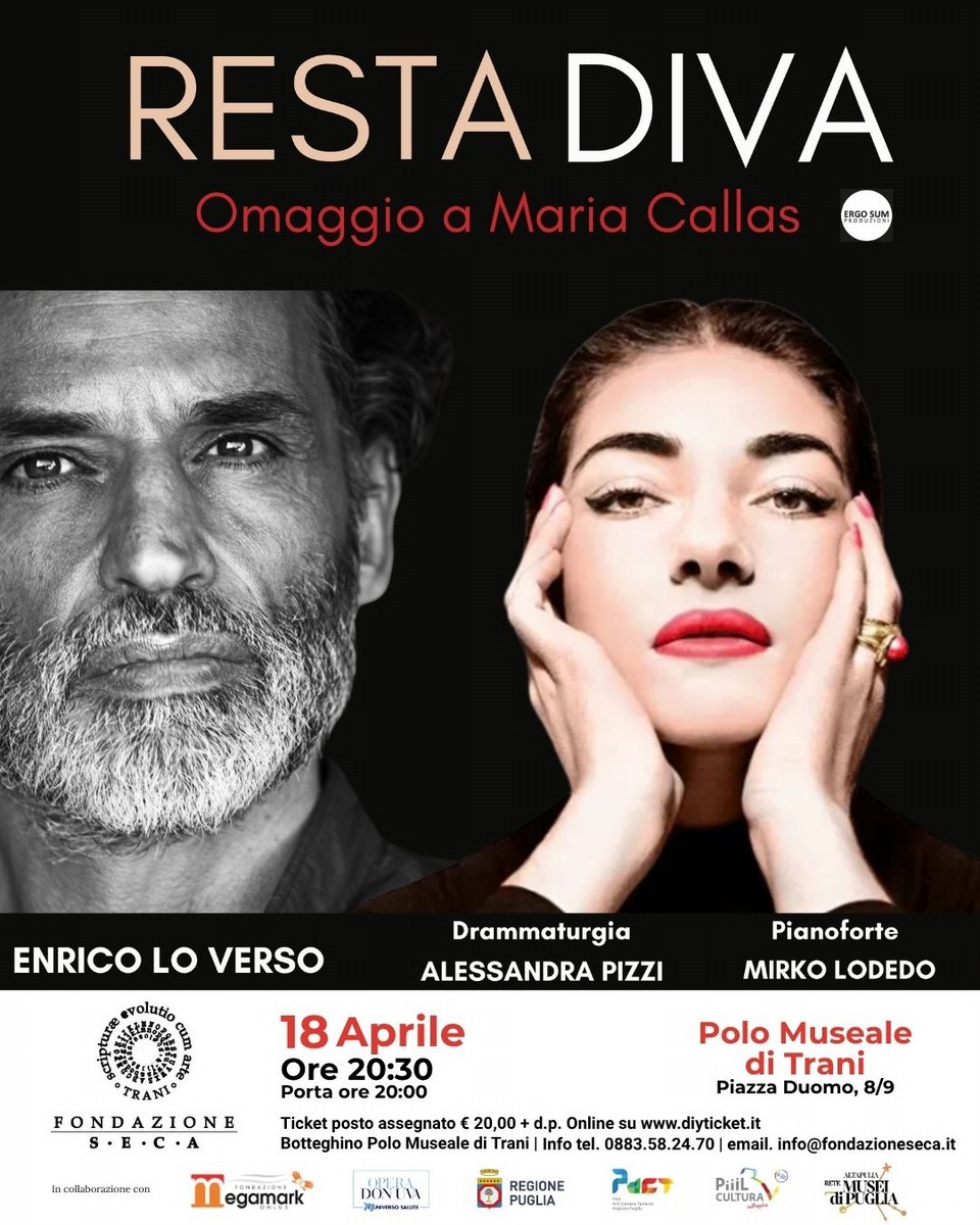 Al Polo Museale di Trani, per l'ultimo appuntamento della Rassegna Teatrale 2026 della Fondazione S.E.C.A., il 18 Aprile andrà in scena lo spettacolo "RESTA DIVA. Omaggio a Maria Callas", con Enrico Lo Verso, pianoforte Mirko Lodedo, regia e drammaturgia di Alessandra Pizzi.