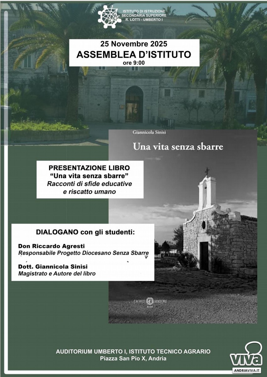 Martedì 25 novembre, a partire dalle ore 9 nell'auditorium della storica sede dell'Istituto Tecnico Agrario di Andria, in piazza San Pio X, sarà presentato il libro "Una vita senza sbarre" di Giannicola Sinisi, edito da Cacucci. Racconti di sfide educative e riscatto umano saranno narrate da Don Riccardo Agresti e dall'ex magistrato della procura barese Giannicola Sinisi.