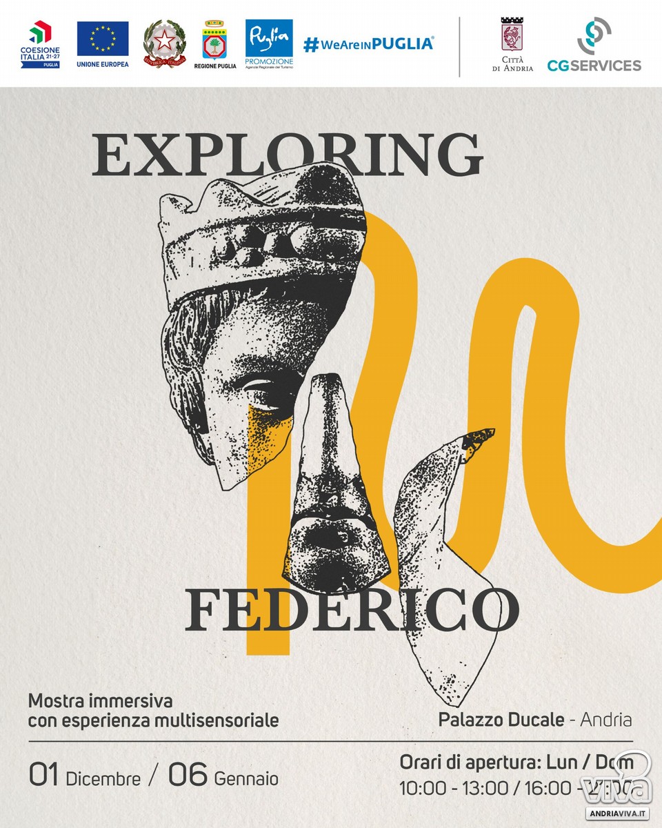 Exploring Federico, visitabile tutti i giorni, dalle 10:00 alle 13:00 e dalle 16:00 alle 21:00, sarà aperta al pubblico dal pomeriggio del 1° dicembre 2025 fino al 6 gennaio 2026 a Palazzo Ducale ad Andria, via Vaglio 17 (ingresso laterale).