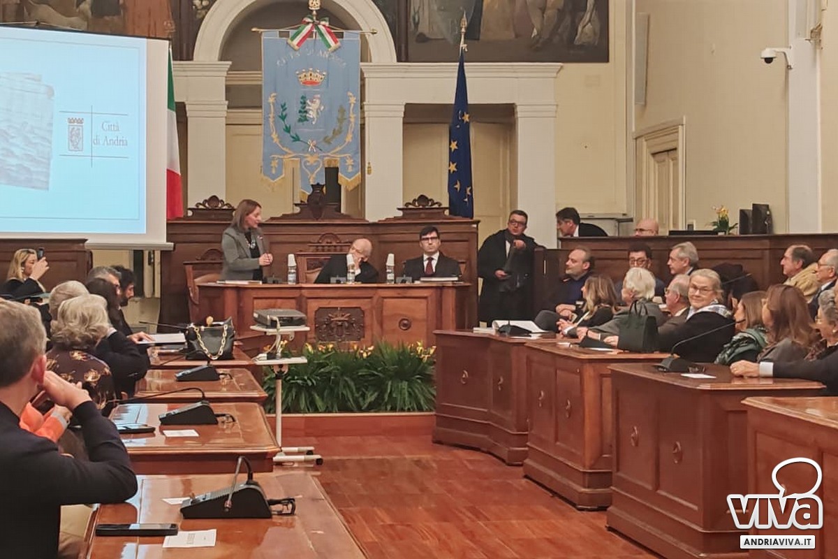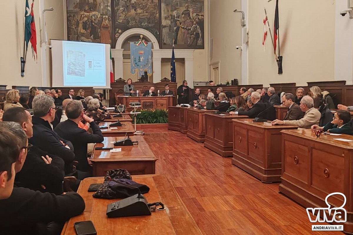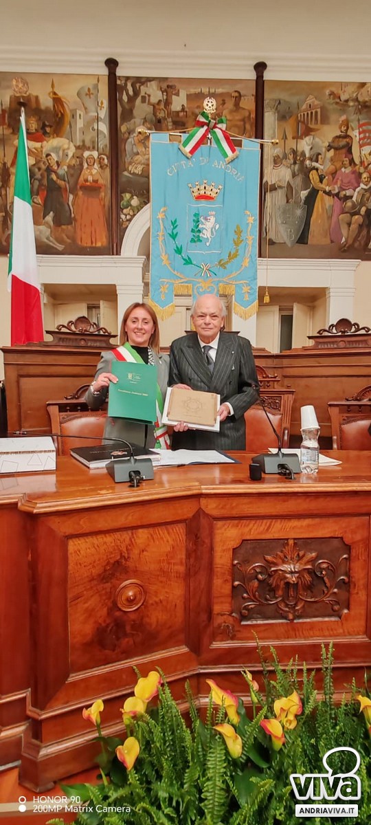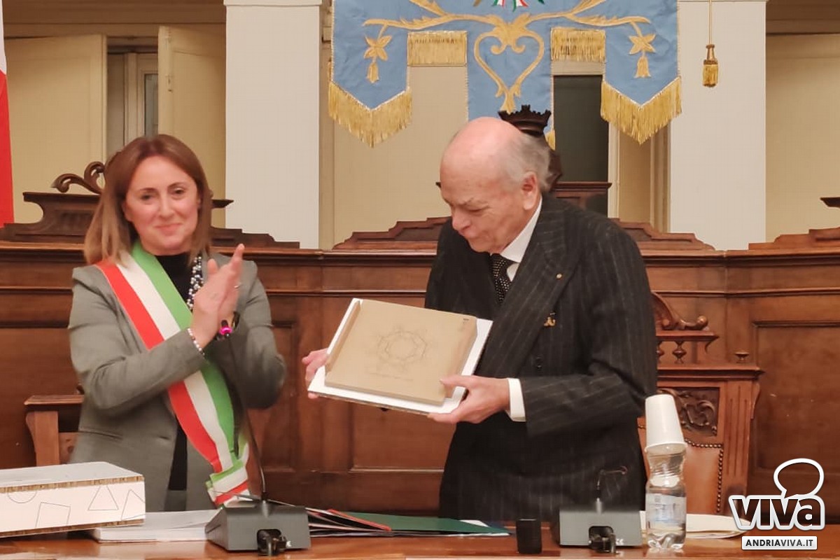 La cerimonia si è svolta nel corso della presentazione del libro "Il Legame con la Terra. Gli Spagnoletti Zeuli e la città di Andria", di Riccardo Giovanni Porro. Il libro racconta la storia di Andria seguendo un filo preciso: il rapporto tra la terra, la società e le trasformazioni della città nel corso del tempo. Attraverso una vasta documentazione d'archivio, l'opera ricostruisce oltre tre secoli di vicende cittadine, dalle origini nel Seicento fino ai profondi cambiamenti dell'età contemporanea. La storia della famiglia Spagnoletti Zeuli non viene presentata come un caso isolato, ma quale chiave di lettura per comprendere dinamiche più ampie. Attorno a questa vicenda, infatti, si muove una rete complessa di famiglie, istituzioni e gruppi sociali che restituisce l'immagine di una città in continua trasformazione. Nel volume si ricostruisce, dunque, un pezzo di storia locale sullo sfondo della Storia nazionale e internazionale, attingendo da archivi pubblici e privati.